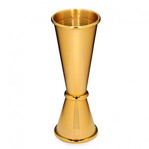 Este jugger de estilo japones presenta incrementos de doble cara. el material de acero inoxidable esta chapado en oro, mostrando un aspecto elegante, permitiendo mediciones consistentes y precisas. este jigger de alta calidad es la herramienta de control, estilo y precisión.
